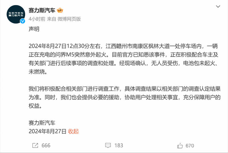 当日晚间,赛力斯汽车于微博发布声明。声明指出,此事故系2024年8月27日12点30分左右,江西赣州市南康区枫林大道一处停车场内发生,一辆正在充电的问界M5突然意外起火。