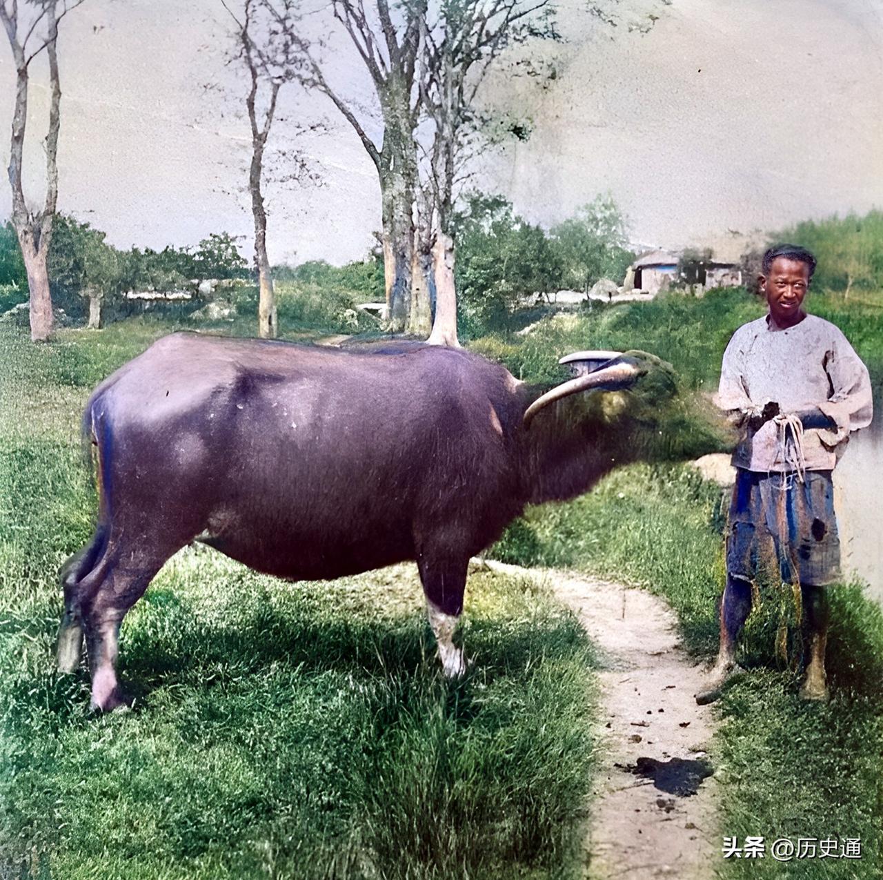 照片中一名乡村青年男子牵着 一头水牛。晚清,中国南方很多乡村家庭选择喂养水牛。水牛虽然食量很大,动作缓慢,但力气大,适合运输重物。每逢初夏到早秋,这也是农村人放牛的最佳时间段。此时,田间地头遍布新鲜的青草。